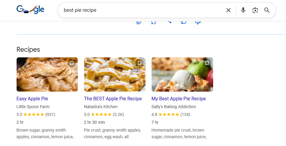 The image below shows compact snippets (containing details like star ratings, images, and prices), which get much higher clicks from search results, as opposed to sites with unstructured data.